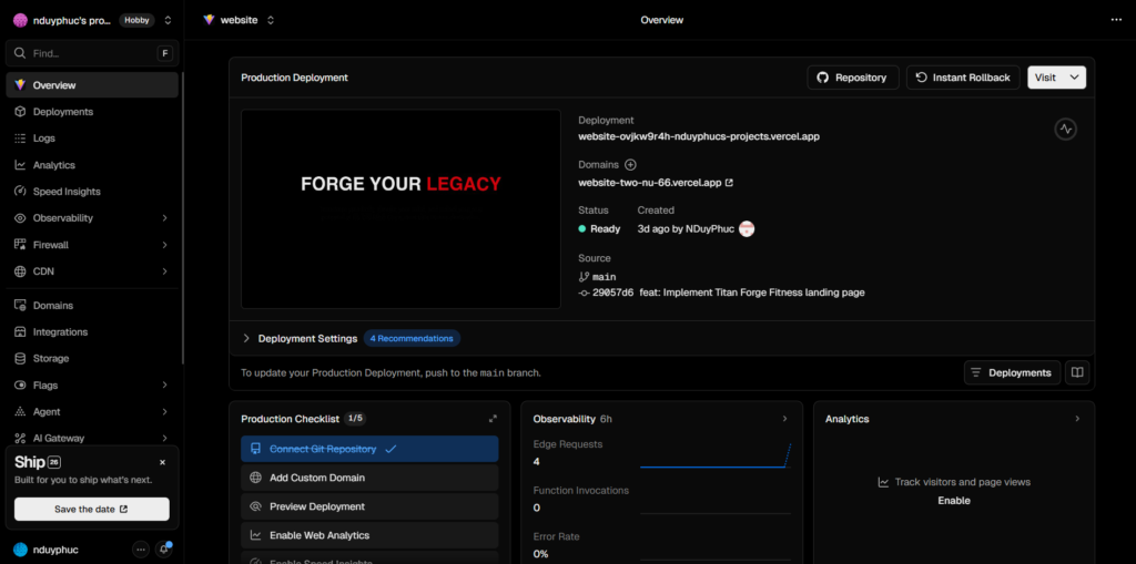 Sau khi bấm deploy, Vercel sẽ tự động build và triển khai website của bạn.