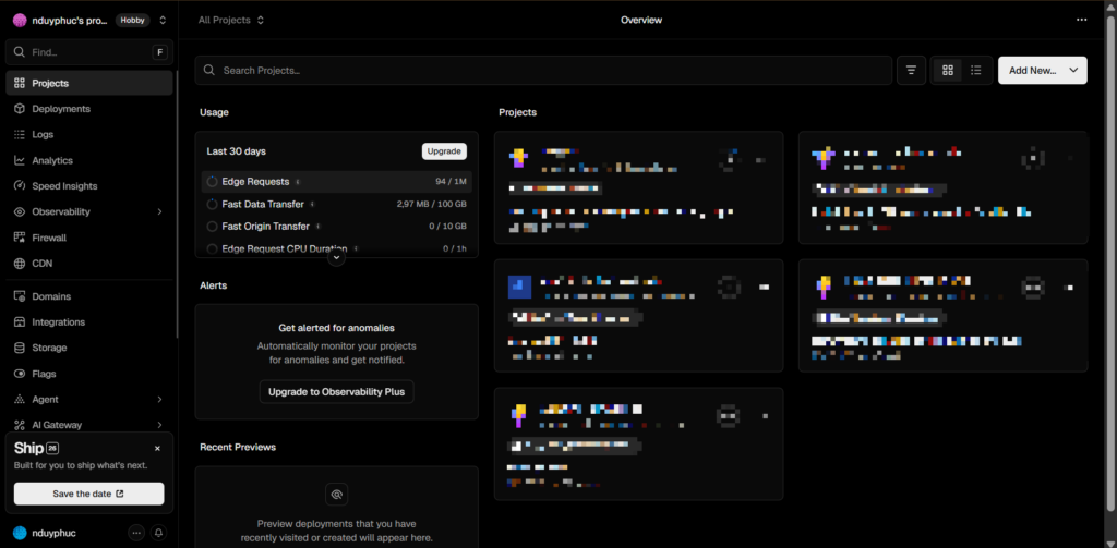 - Vercel Docs – Projects overview: Tài liệu tổng quan về project trên Vercel, bao gồm quản lý deployment, domain và cấu hình project. (Vercel)