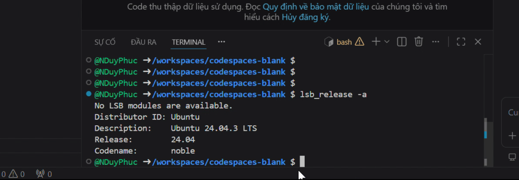 Trong giao diện Codespaces, mở tab Terminal ở phía dưới. Nếu chưa thấy, bạn có thể mở terminal bằng phím tắt như trong VS Code.
